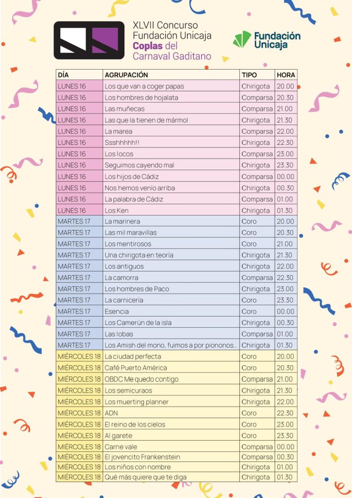 Fundación Unicaja celebra un año más el Carnaval de Cádiz con la XLVII edición de su tradicional concurso de coplas, que arranca el próximo lunes con las actuaciones de un total de 36 agrupaciones durante los días 16, 17 y 18 de febrero en el tablao de la céntrica Plaza de San Agustín.