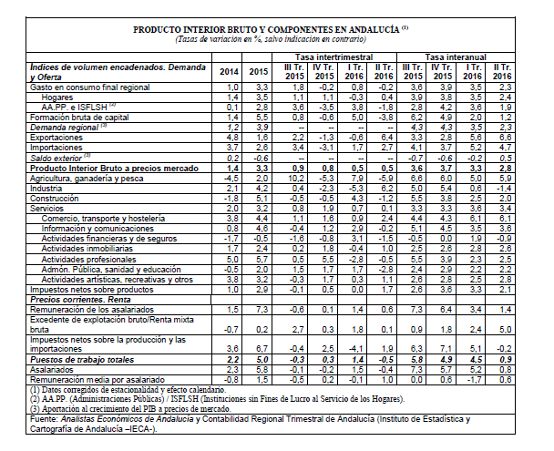 La información coyuntural más reciente, relativa al segundo trimestre de 2016, señala que la economía andaluza registró un crecimiento intertrimestral de la producción del 0,5%, igual al del trimestre anterior. En términos interanuales, la variación del PIB ha sido del 2,8%, frente al 3,3% registrado en los tres primeros meses del año.