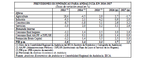Para 2016, Analistas Económicos de Andalucía prevé que la economía andaluza experimente un crecimiento anual del 2,7% (3,0% para España). En lo que respecta a la demanda interna, el consumo de los hogares y la inversión se incrementarían en un 3,0% y 2,5%, respectivamente, mientras que el consumo de las AA.PP. lo haría en un 1,4%. Por el lado de la oferta, el crecimiento se sustentaría en la aportación positiva de todos los sectores, que presentarían incrementos de la producción de entre el 0,9%, en la industria, y el 3,1%, en los servicios.