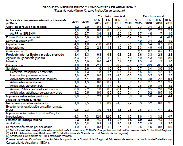 La información coyuntural más reciente, relativa al tercer trimestre de 2016, señala que la economía andaluza registró un crecimiento intertrimestral de la producción del 0,8%, 0,2 p.p. superior al del trimestre anterior. En términos interanuales, la variación del PIB ha sido del 2,8%.