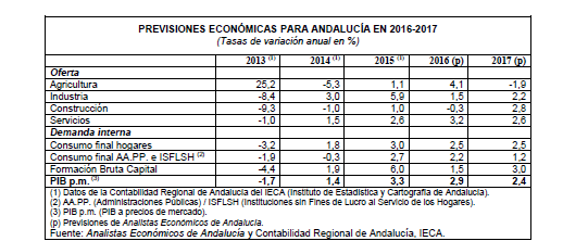 Las previsiones realizadas para 2017 sitúan la tasa de crecimiento de la economía andaluza en el 2,4%, similar a la prevista para España. Por el lado de la demanda, se prevé un crecimiento del consumo privado del 2,5%, mientras que el de las AA.PP. experimentaría un aumento del 1,2%. Por su parte, la inversión se vería incrementada en un 3,0%. Desde el punto de vista de la oferta, el crecimiento del PIB respondería a la aportación positiva de los sectores no agrarios, estimándose un aumento del 2,6% para el sector servicios, en tanto que la industria y la construcción crecerían en un 2,2% y un 2,8%, respectivamente.