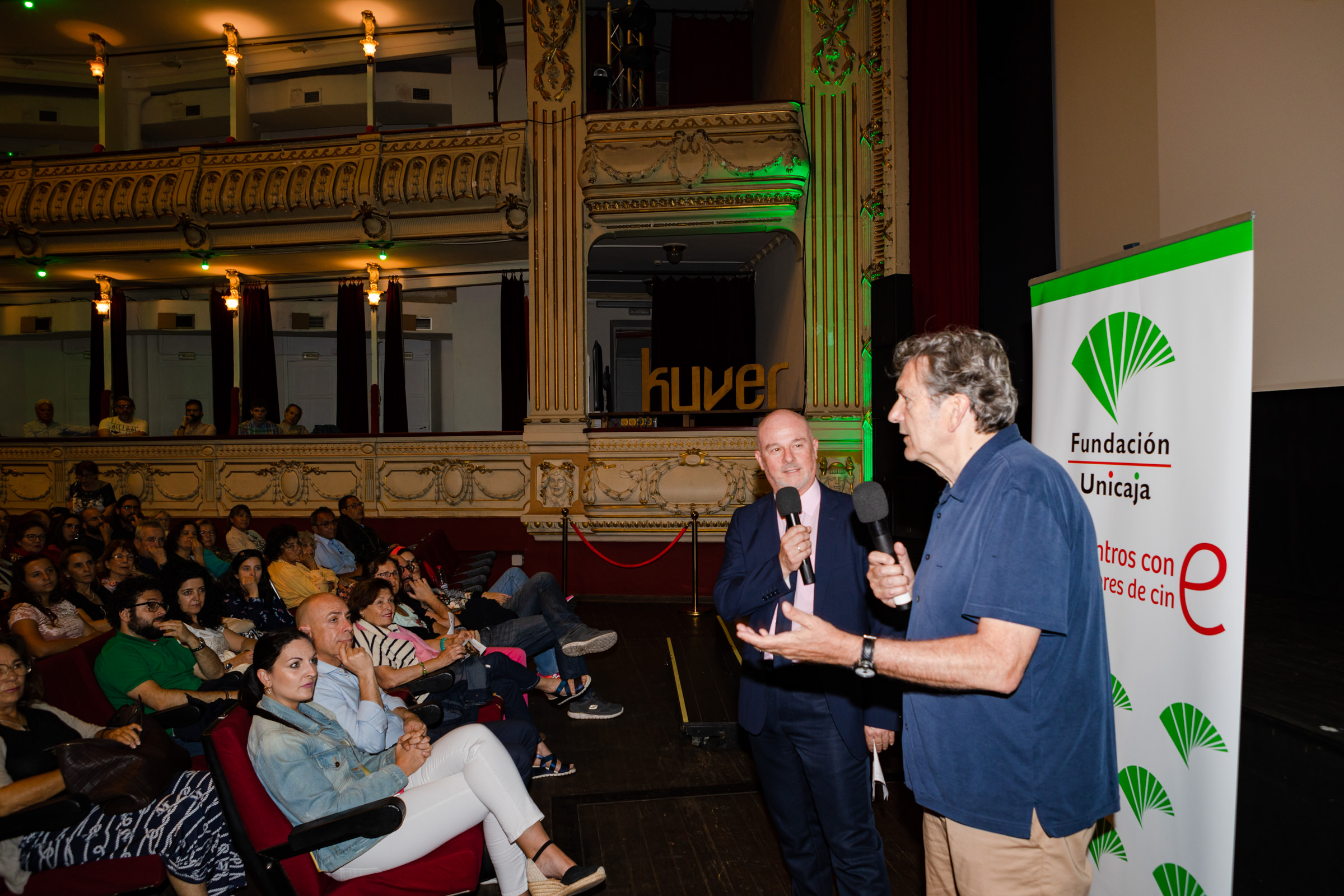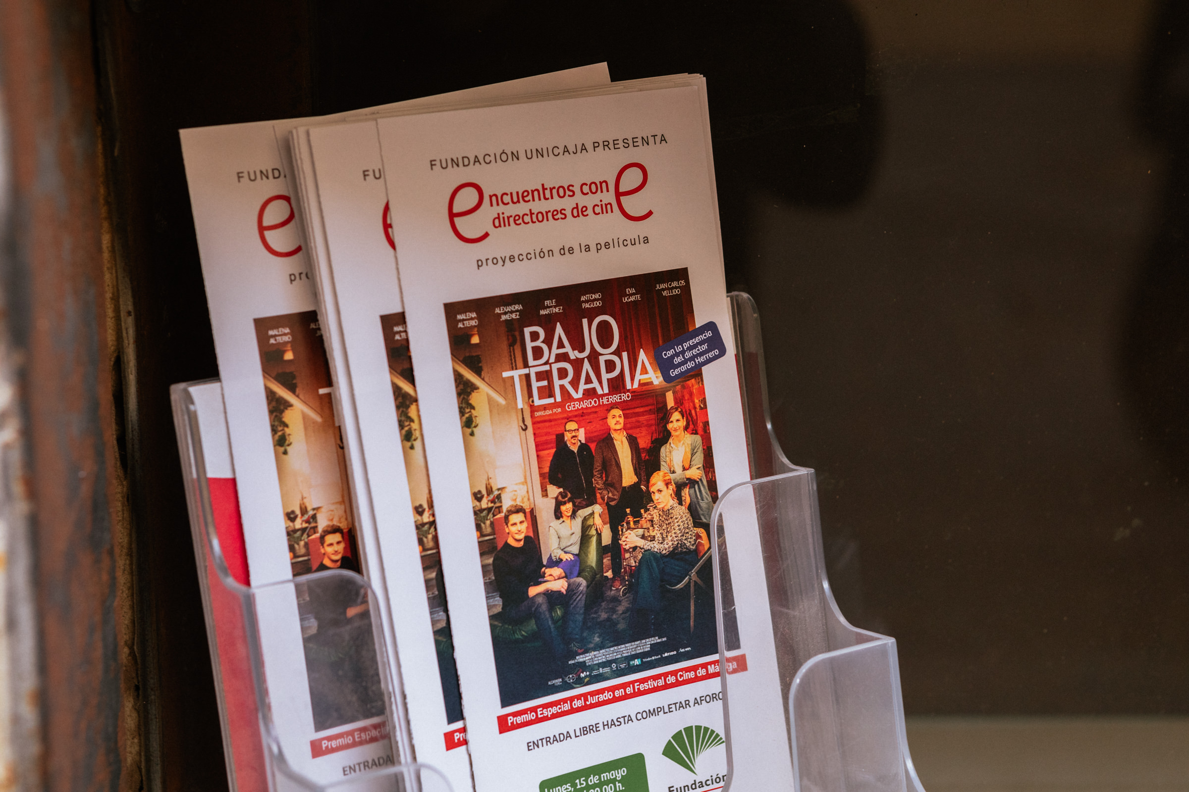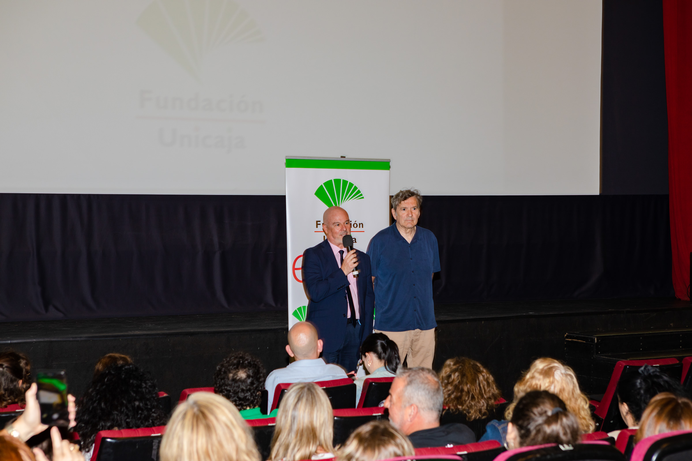 Fundación Unicaja organizó este lunes una nueva cita de su ciclo ‘Encuentros con directores de cine’ con la proyección y coloquio de la película ‘Bajo terapia’, de Gerardo Herrero. El responsable de Literatura de la Fundación Unicaja, Francisco Cañadas, y el patrono de Fundación Unicaja Ignacio Ortega asistieron a la proyección del filme en el Teatro Cervantes Almería, tras el cual se desarrolló un coloquio en el que el público tuvo la oportunidad de dialogar con el director sobre la película y su carrera cinematográfica.