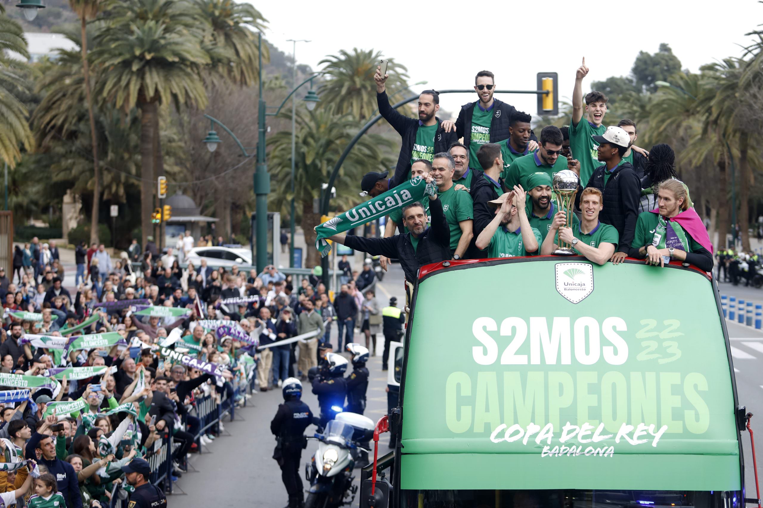 Málaga recibió este lunes entre vítores y aplausos al Unicaja Baloncesto en la fiesta de celebración del título de la Copa del Rey de la ACB, conquistado este pasado domingo en el Olímpic de Badalona. El equipo al completo recorrió las calles de Málaga en un autobús descapotable que los llevó desde el pabellón de Los Guindos hasta la Plaza de la Marina, sede de la Fundación Unicaja, además de al Ayuntamiento de Málaga, para compartir con su afición el ansiado título.