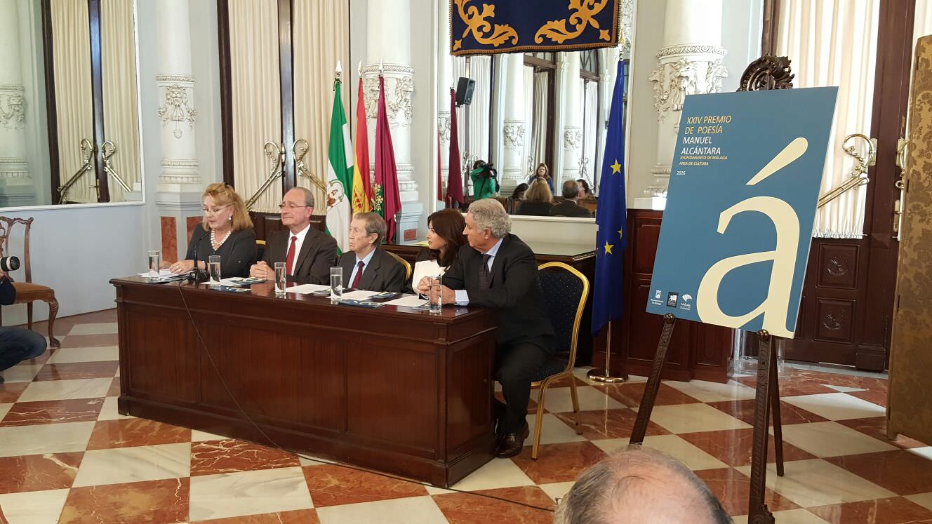 El alcalde de Málaga, Francisco de la Torre, y la directora general de la Fundación Bancaria Unicaja, Dolores Cano, acompañados de la concejala de Cultura, Gemma del Corral, el escritor Manuel Alcántara y el presidente de la Fundación Alcántara, Antonio Pedraza, han presentado esta mañana la convocatoria de la XXIV edición del Premio de Poesía Manuel Alcántara que cuenta con una dotación de 6.000 euros. Este premio, organizado por el Ayuntamiento de Málaga desde el año 2005, está patrocinado por la Fundación Unicaja y cuenta con la colaboración de la Fundación Alcántara.