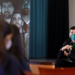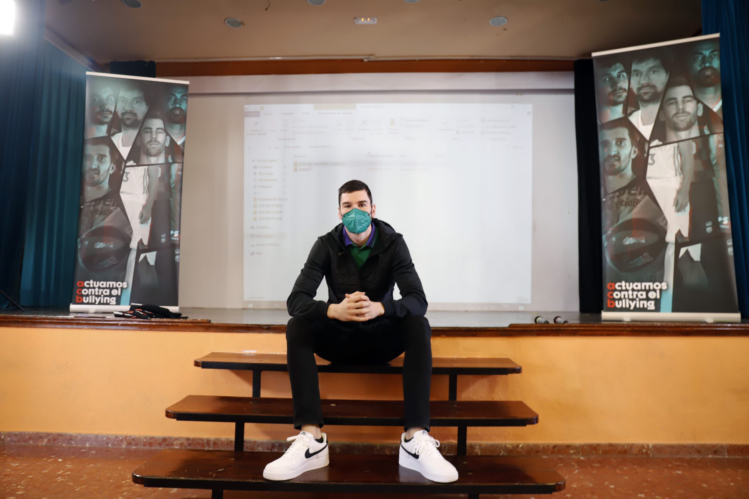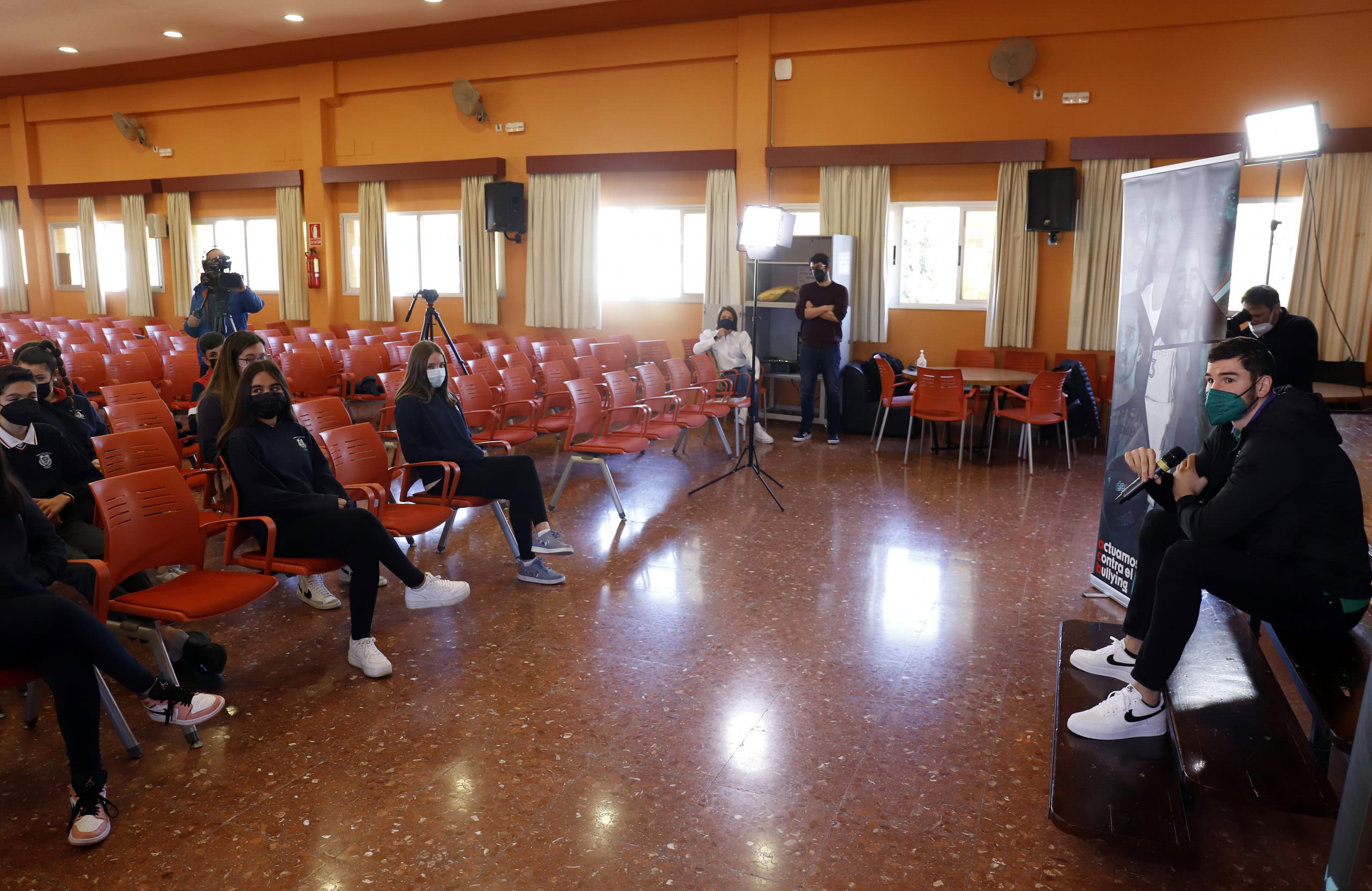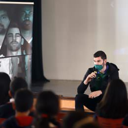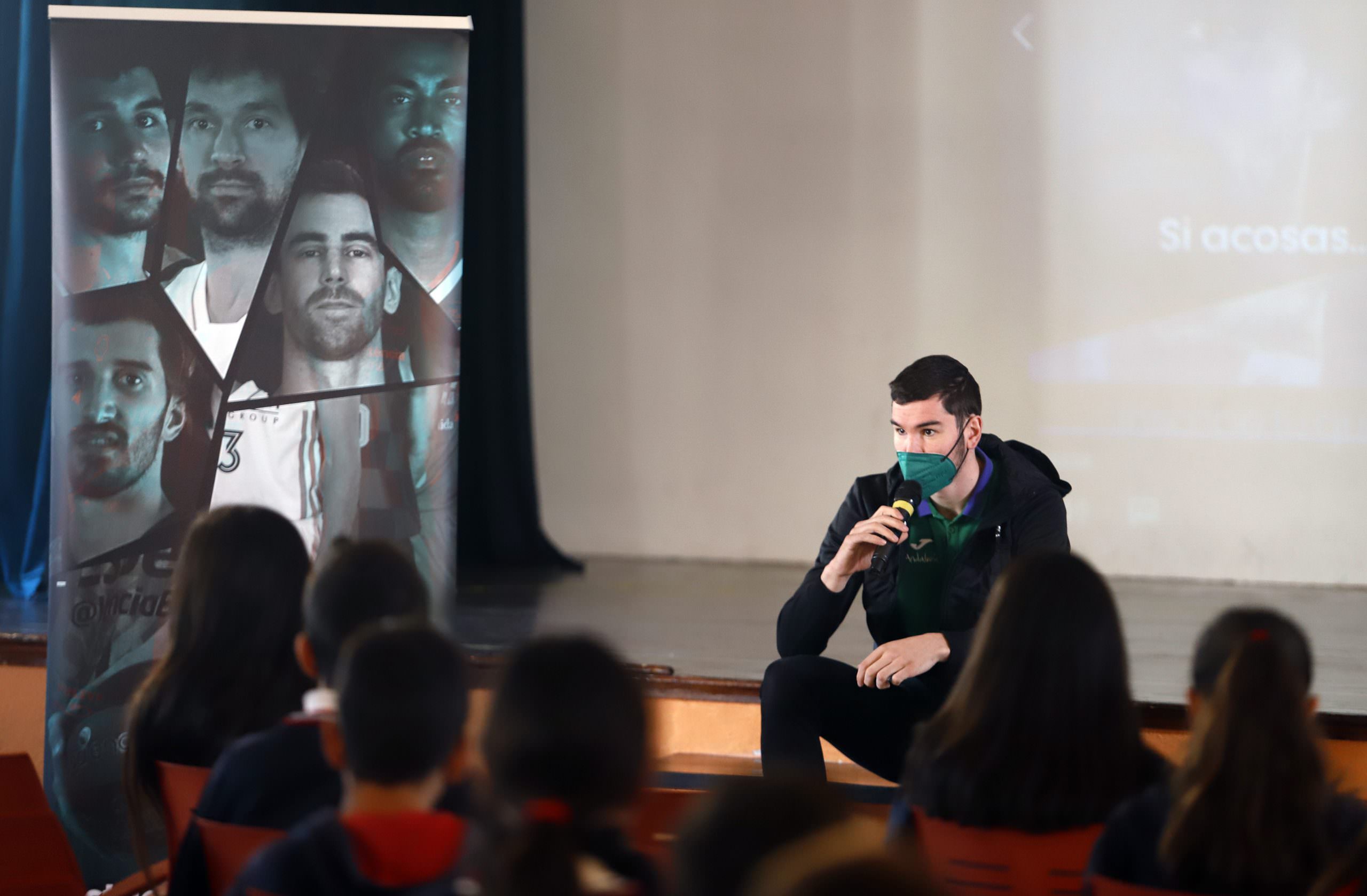 El jugador del Unicaja animó a los alumnos a denunciar casos de acoso y les conminó a no tener miedo a que otro compañero le llame «chivato», porque aseguró que ser «chivado» puede ayudar a otro alumno que sufre acoso. El escolta compartió con la clase algunas duras experiencias que él tuvo en el colegio o en sus equipos de baloncesto cuando era menor, e invitó al alumnado a crear un ‘Quinteto contra el Bullying’, para buscar soluciones y respuestas a este problema.