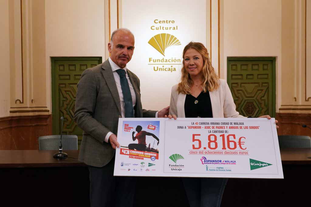 Fundación Unicaja, el Ayuntamiento de Málaga y El Corte Inglés han entregado hoy la recaudación obtenida de la 43ª Carrera Urbana ‘Ciudad de Málaga’ celebrada el pasado 22 de octubre, que este año se ha destinado al Centro de Acogida San Juan de Dios, Down Málaga y la Asociación de Padres y Amigos de los Sordos de Málaga (Aspansor), que han recibido un cheque por valor de 5.816 euros cada una para el mantenimiento y apoyo de su labor social.