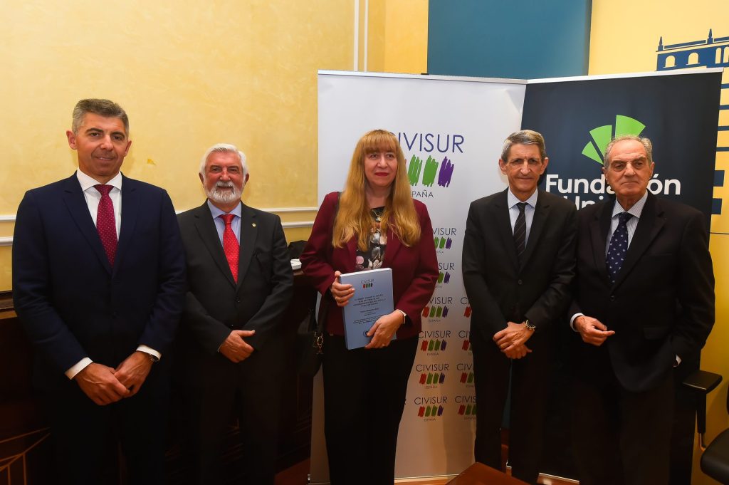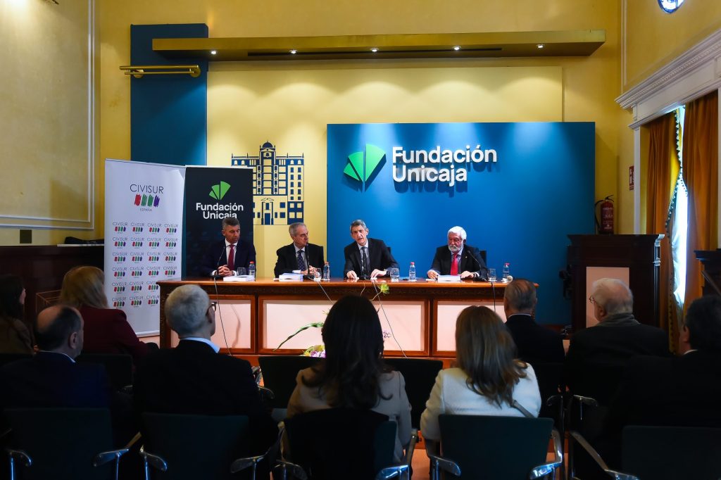 El acto ha tenido lugar esta mañana en el Salón de Actos Unicaja de la Acera de la Marina y ha contado con la asistencia del presidente de la Fundación Unicaja, José M. Domínguez, junto al presidente de CIVISUR Málaga,  Luis Merino; el vicepresidente de CIVISUR, Daniel Carrasco, y el vicerrector de Doctorado y Posgrado de la Universidad de Málaga, Salvador Pérez.