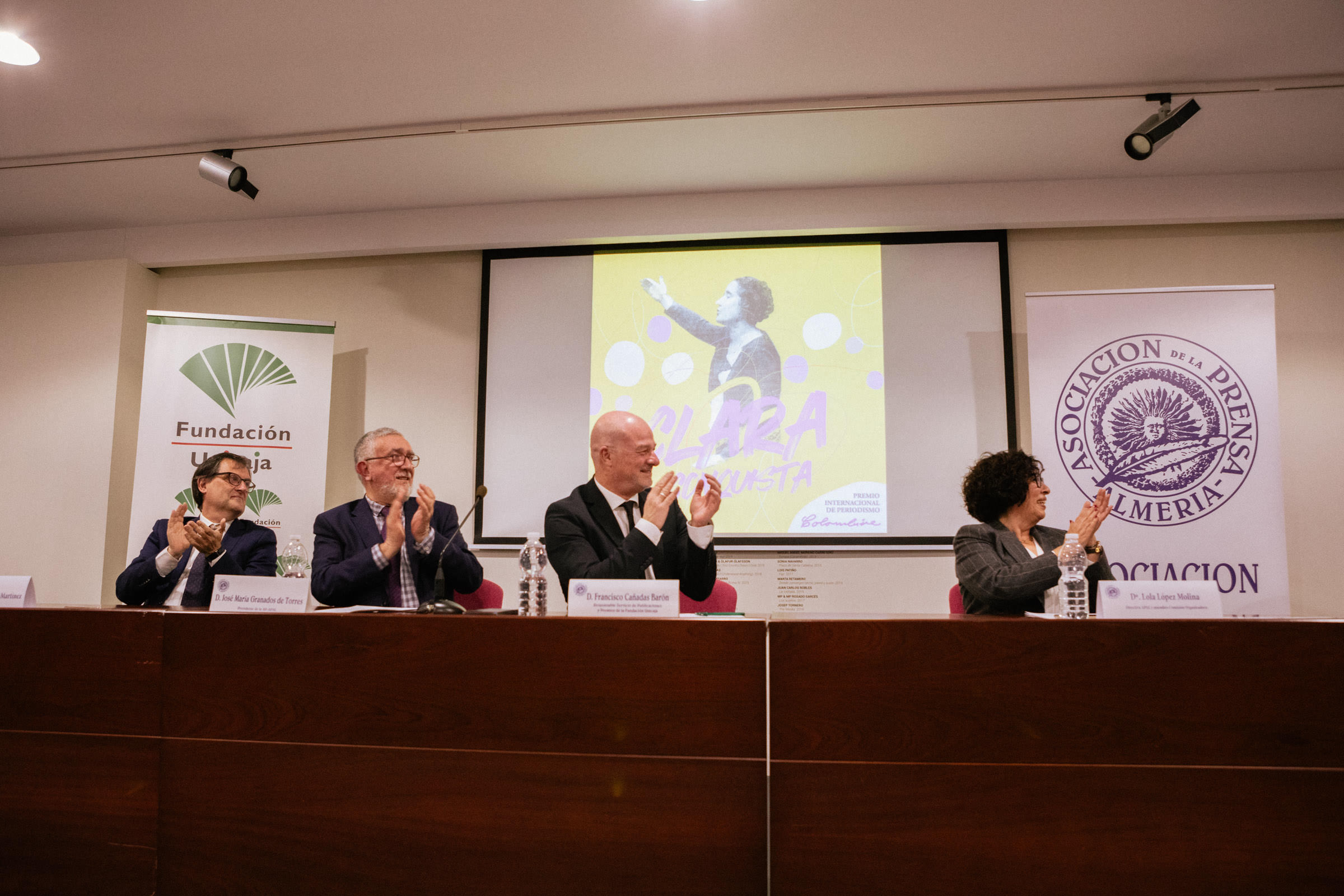 Los periodistas Isaías Lafuente, Ana Alonso, Roberto García y Gema Jiménez han recibido el XI Premio Internacional de Periodismo Colombine por el podcast ‘Clara conquista’ de Cadena Ser. Este certamen, organizado por la Asociación de la Prensa de Almería (AP-APAL) y patrocinado por la Fundación Unicaja, toma el nombre de la primera periodista profesional de España, la almeriense Carmen de Burgos Seguí, conocida con el seudónimo, Colombine.