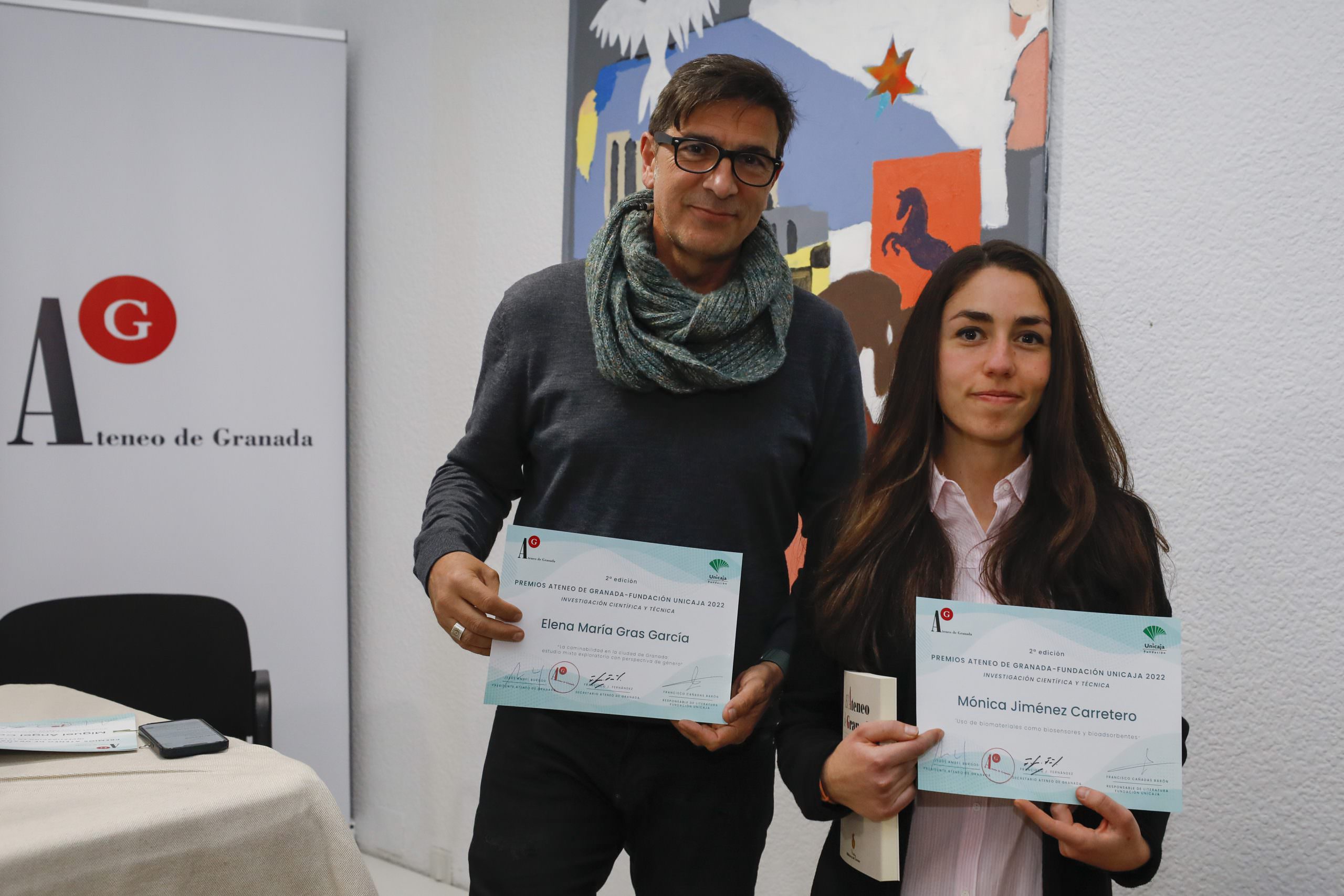 El presidente del Ateneo de Granada, Jesús Ambel, y el responsable de Literatura de la Fundación Unicaja, Francisco Cañadas, han hecho entrega este lunes de los premios anuales de la institución a seis jóvenes investigadores en las áreas científica, técnica, cultural y social.