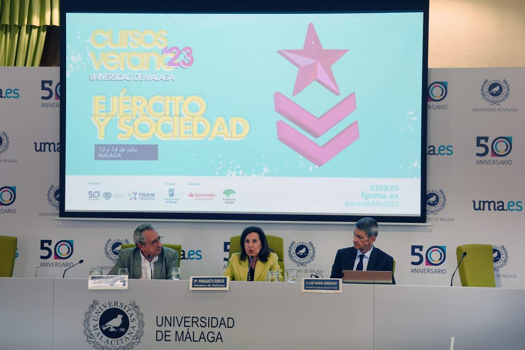 El Rectorado de la Universidad de Málaga acogió ayer la celebración de la última jornada del curso de verano ‘Ejército y sociedad’, organizado por la Fundación General de la Universidad de Málaga (FGUMA) con el patrocinio de la Fundación Bancaria Unicaja, que ha contado con la presencia de la ministra de Defensa, Margarita Robles, en la clausura de los cursos.