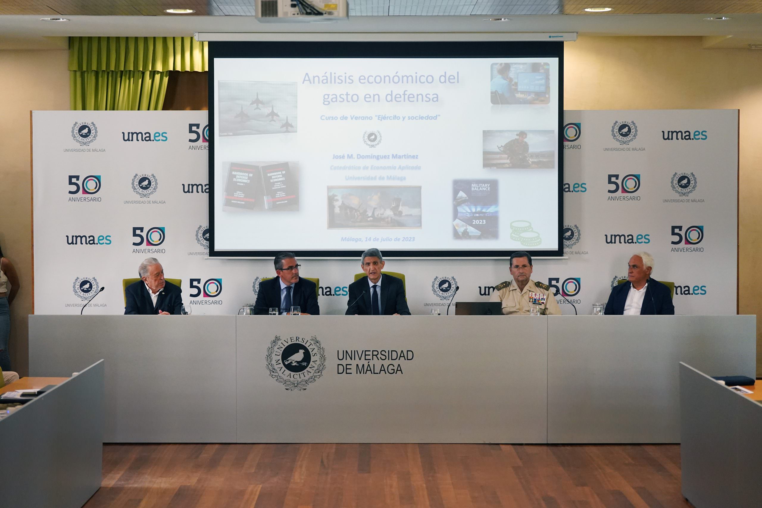 El presidente de la Fundación Bancaria Unicaja, José M. Domínguez, participó durante el trascurso de la jornada con la conferencia titulada ‘Análisis económico del gasto en Defensa’, que contó con la presentación del director general de la institución, Sergio Corral. Posteriormente, Margarita Robles ofreció la ponencia de clausura que da nombre al curso, acompañada por el rector de la Universidad de Málaga, José Ángel Narváez, y José M. Domínguez.