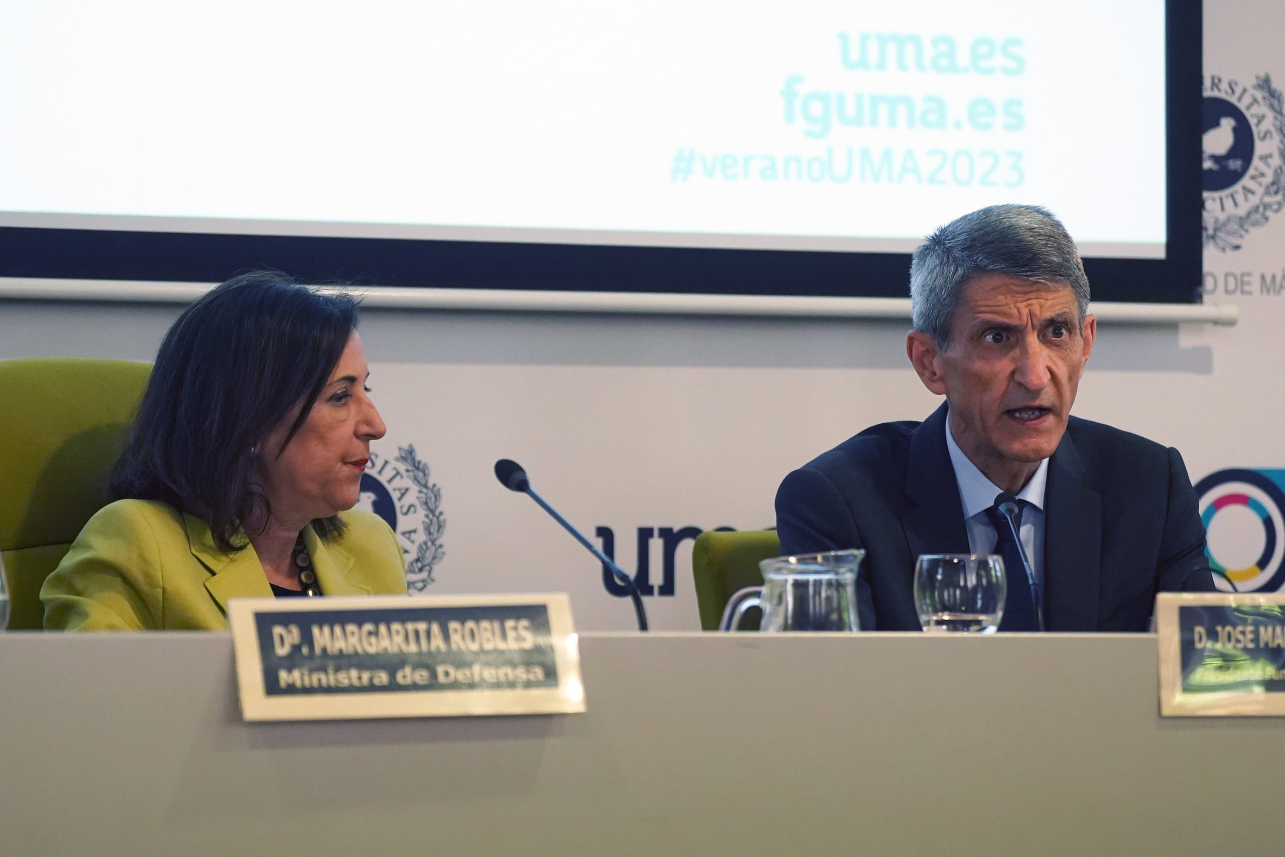 El Rectorado de la Universidad de Málaga acogió ayer la celebración de la última jornada del curso de verano ‘Ejército y sociedad’, organizado por la Fundación General de la Universidad de Málaga (FGUMA) con el patrocinio de la Fundación Bancaria Unicaja, que ha contado con la presencia de la ministra de Defensa, Margarita Robles, en la clausura de los cursos.