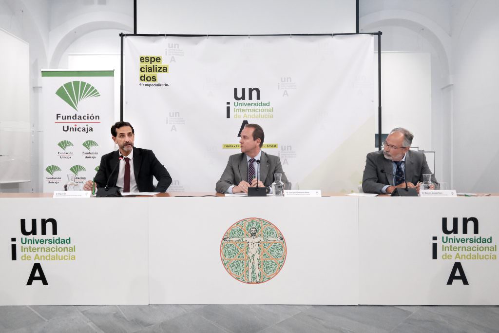 El acto ha contado con la presencia del director de Actividades Sociales de la Fundación Unicaja, Miguel Gil; el rector de la Universidad Internacional de Andalucía, José Ignacio García, y el vicerrector de Formación Permanente y Extensión Universitaria, Manuel Acosta.