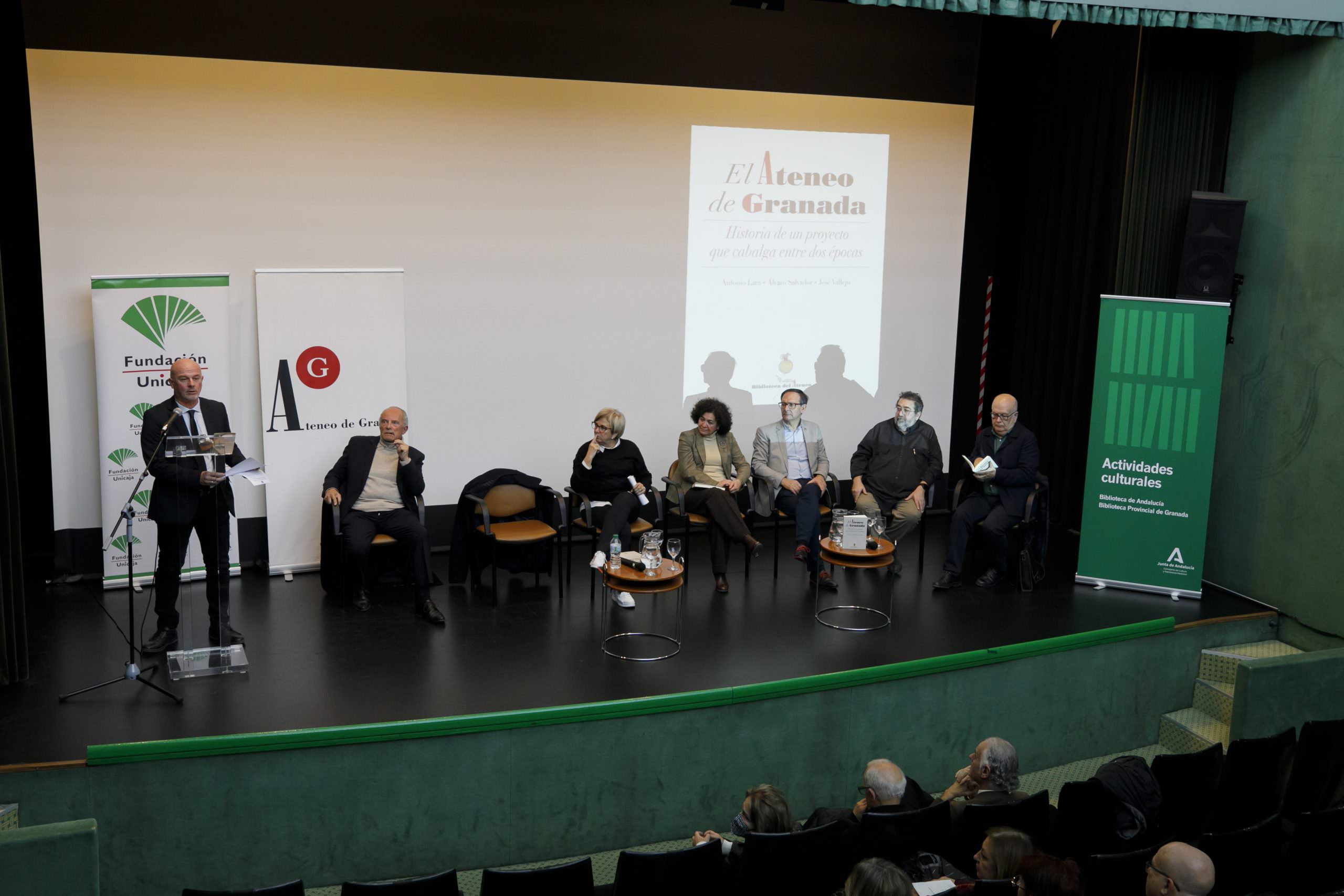 Fundación Unicaja colabora en la edición del libro ‘El Ateneo de Granada. Historia de un proyecto que cabalga entre dos épocas’ que recopila la historia reciente de esta institución creada en el año 1925. El responsable de Literatura de la Fundación Unicaja, Francisco Cañadas, ha asistido este martes en la Biblioteca de Andalucía de Granada a la presentación de este volumen, que ha contado con la asistencia de la rectora de la Universidad de Granada, Pilar Aranda; la concejala de Cultura y Patrimonio del Ayuntamiento de Granada, María de Leyva; la concejala de Cultura del Ayuntamiento de Albolote, Antonia Guerrero; el presidente del Ateneo de Granada, Jesús Ambel y los autores del libro, los escritores Antonio Lara, Álvaro Salvador y José Vallejo.