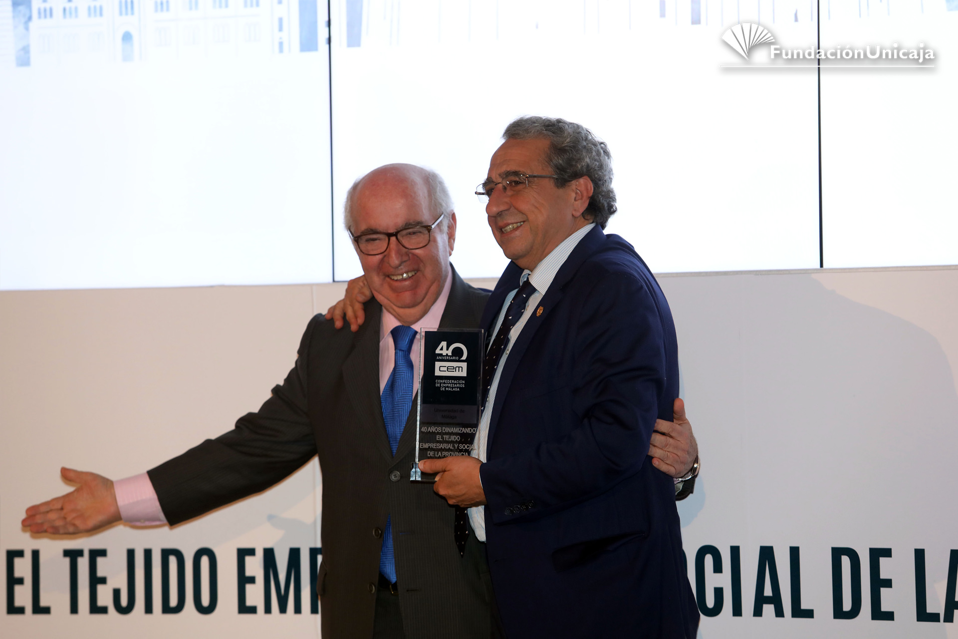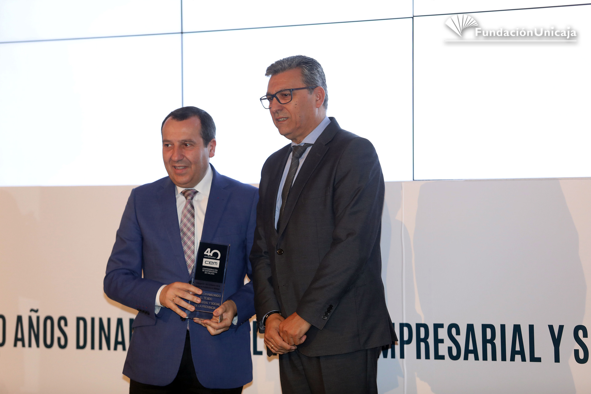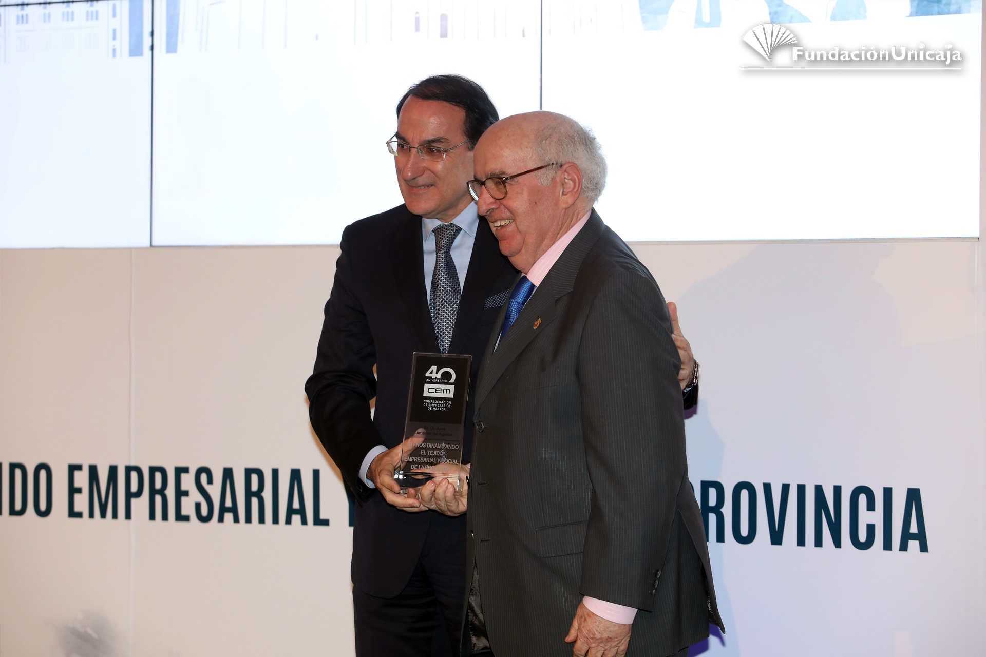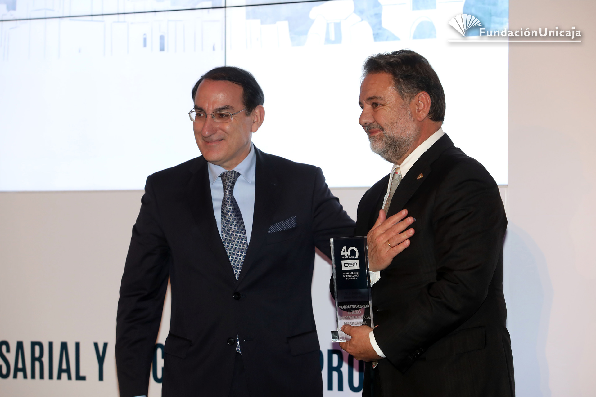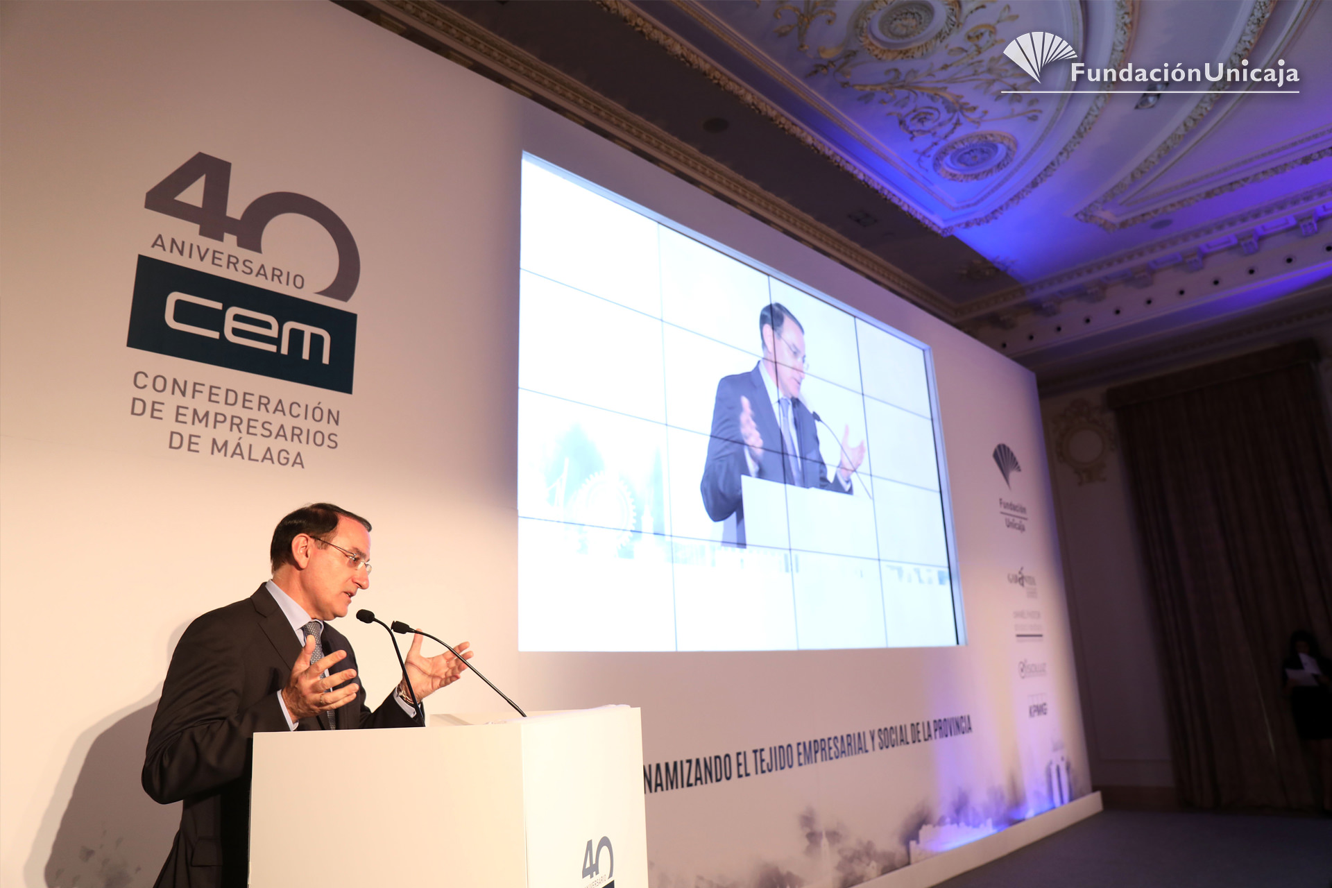 Fundación Unicaja ha estado presente, en calidad de entidad aliada y colaboradora, en la conmemoración de los primeros cuarenta años de existencia de la Confederación de Empresarios de Málaga (CEM), una organización, la patronal malagueña, que fue fundada en septiembre de 1977, en pleno despegue social y democrático, y que actualmente cuenta con una afiliación en la provincia superior al centenar de corporaciones y a las 45.000 pymes.