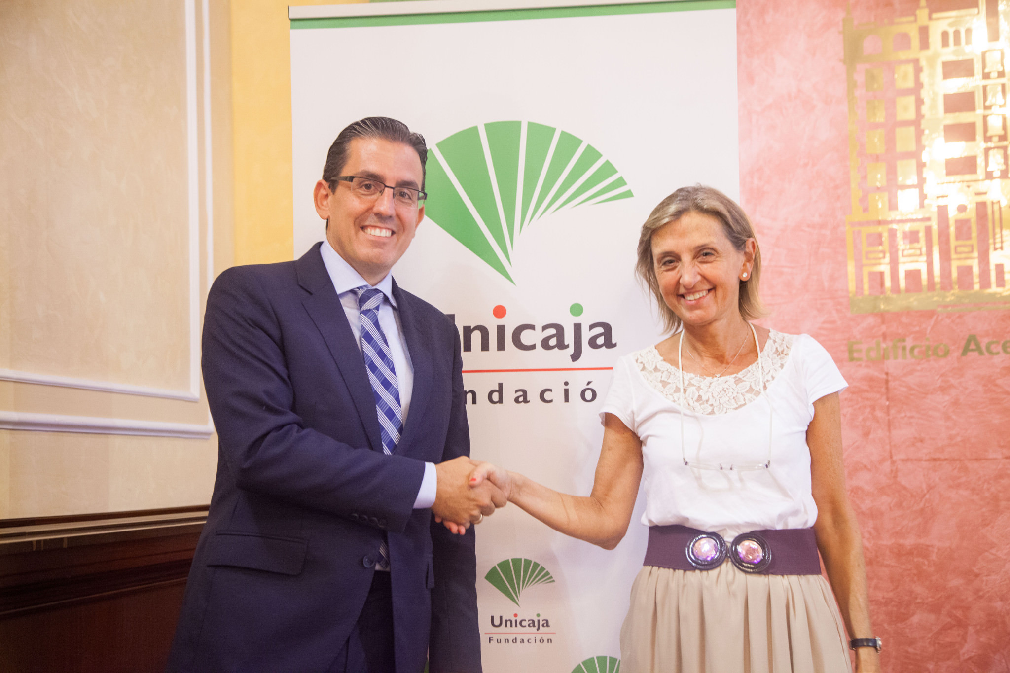 En la primera imagen, Sergio Corral, director general de la Fundación Unicaja, y Angie Moreno, directora gerente de Fundación Harena, durante la firma del convenio de colaboración