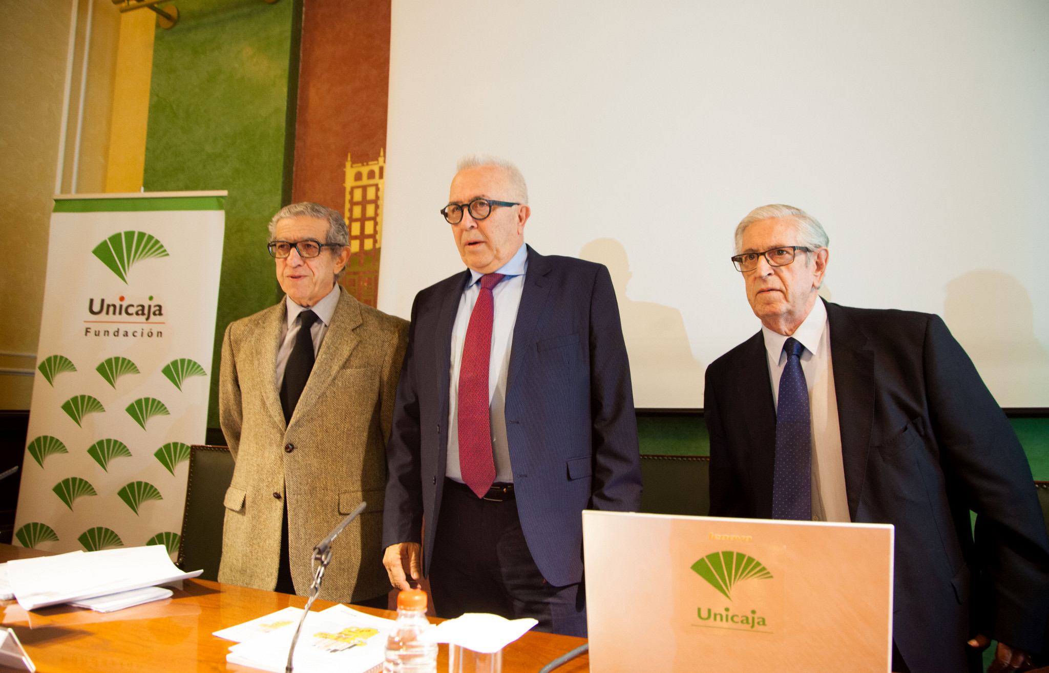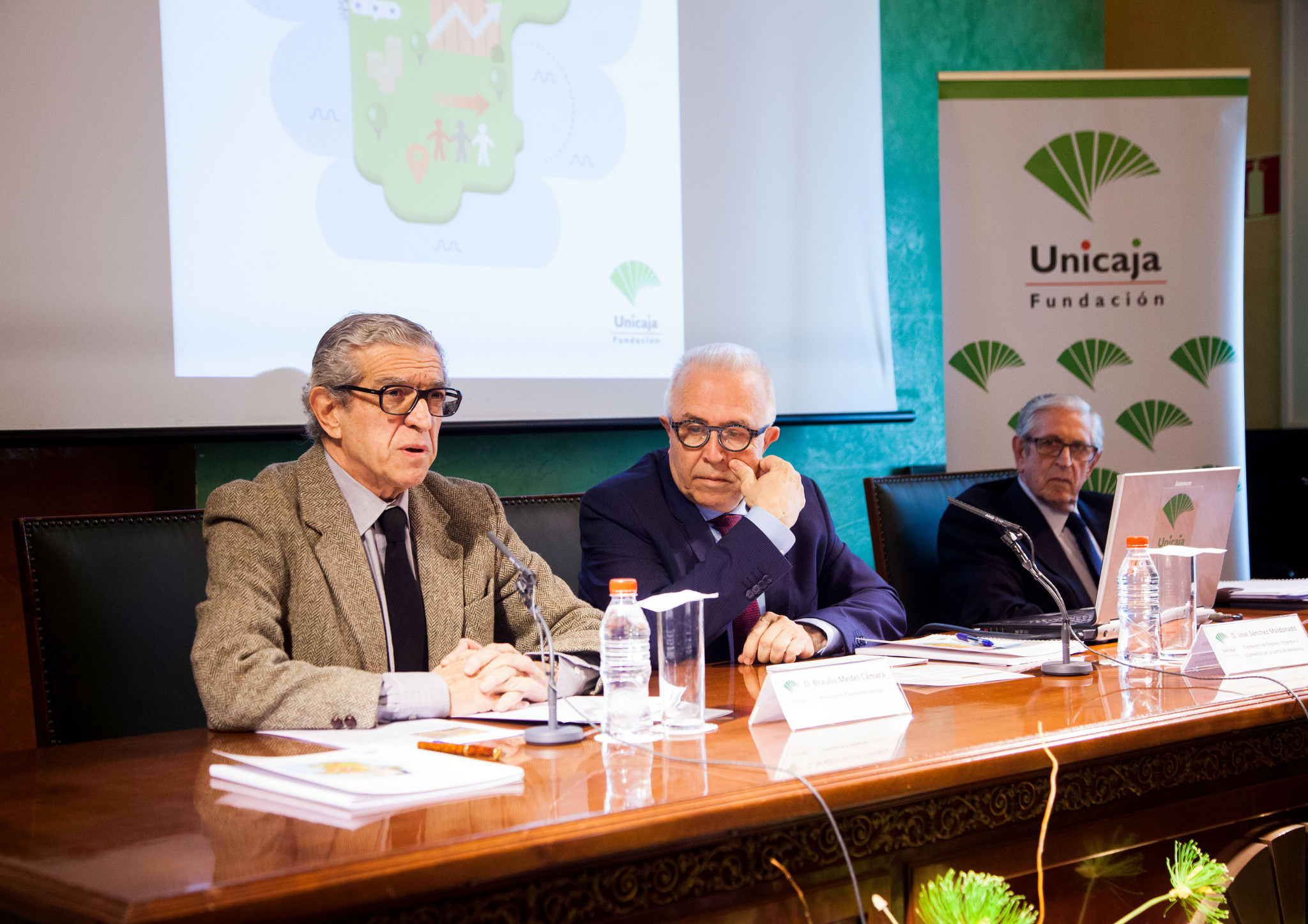 En las siguientes imágenes aparecen, de izquierda a derecha, el Director de las jornadas y Presidente de la Fundación Unicaja, Braulio Medel; el Consejero de Empleo, Empresa y Comercio de la Junta de Andalucía, José Sánchez Maldonado, y Victorio Valle Sánchez, también Director de este encuentro y Presidente del Consejo Consultivo de la Fundación de las Cajas de Ahorros (Funcas):