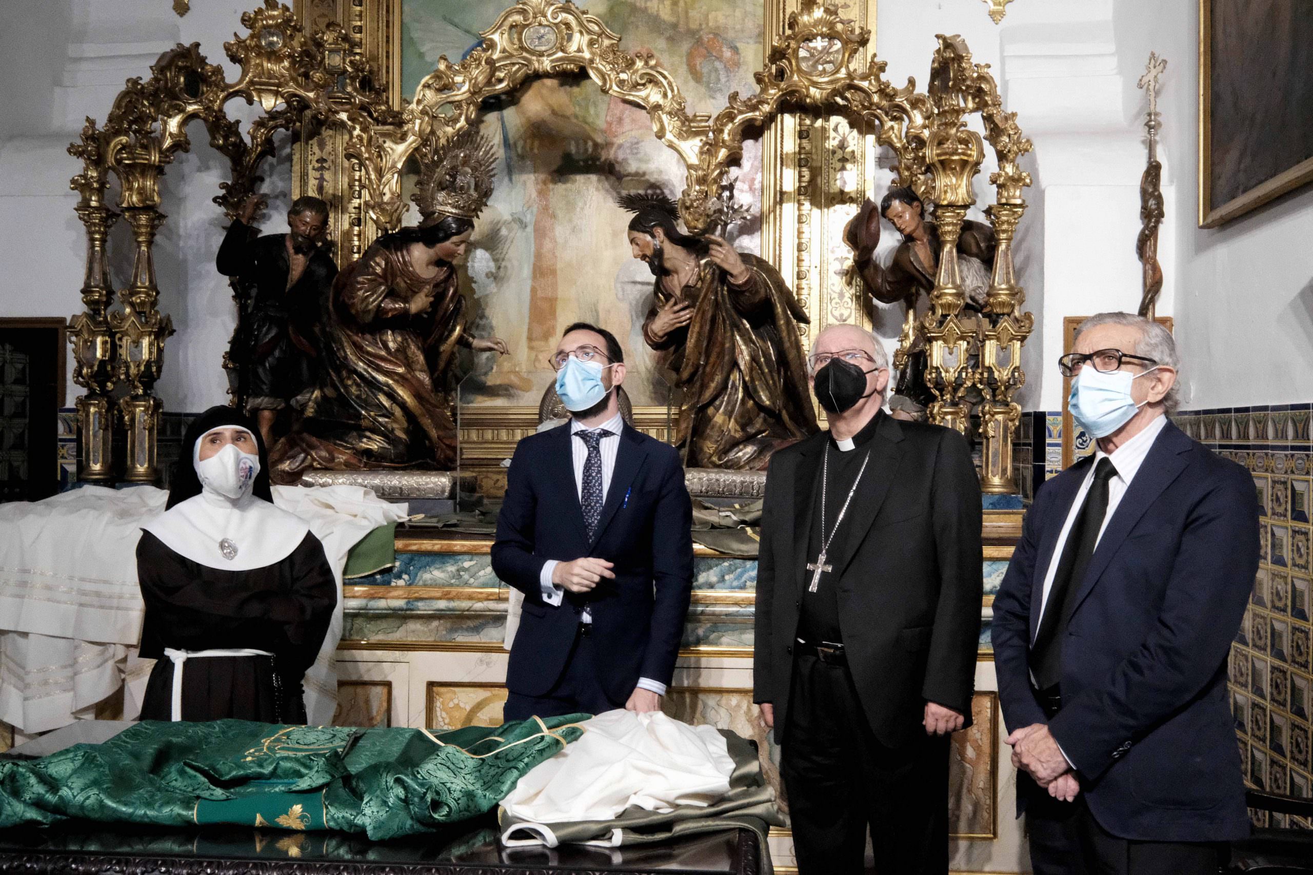 Hoy se ha clausurado la exposición con una eucaristía en la que también se ha bendecido la imagen de Nuestro Padre Jesús Nazareno del Perdón y las nuevas potencias que se han elaborado para el Nazareno, obra realizada en plata sobredorada y amatistas, estilo rocalla, por el artista sevillano Ramón León. Tras la misa oficiada por el arzobispo José Ángel Saiz Meneses, y unas palabras de agradecimiento de la madre abadesa del convento, Sor Lucía Durán, la comitiva ha realizado una visita guiada por la exposición.
