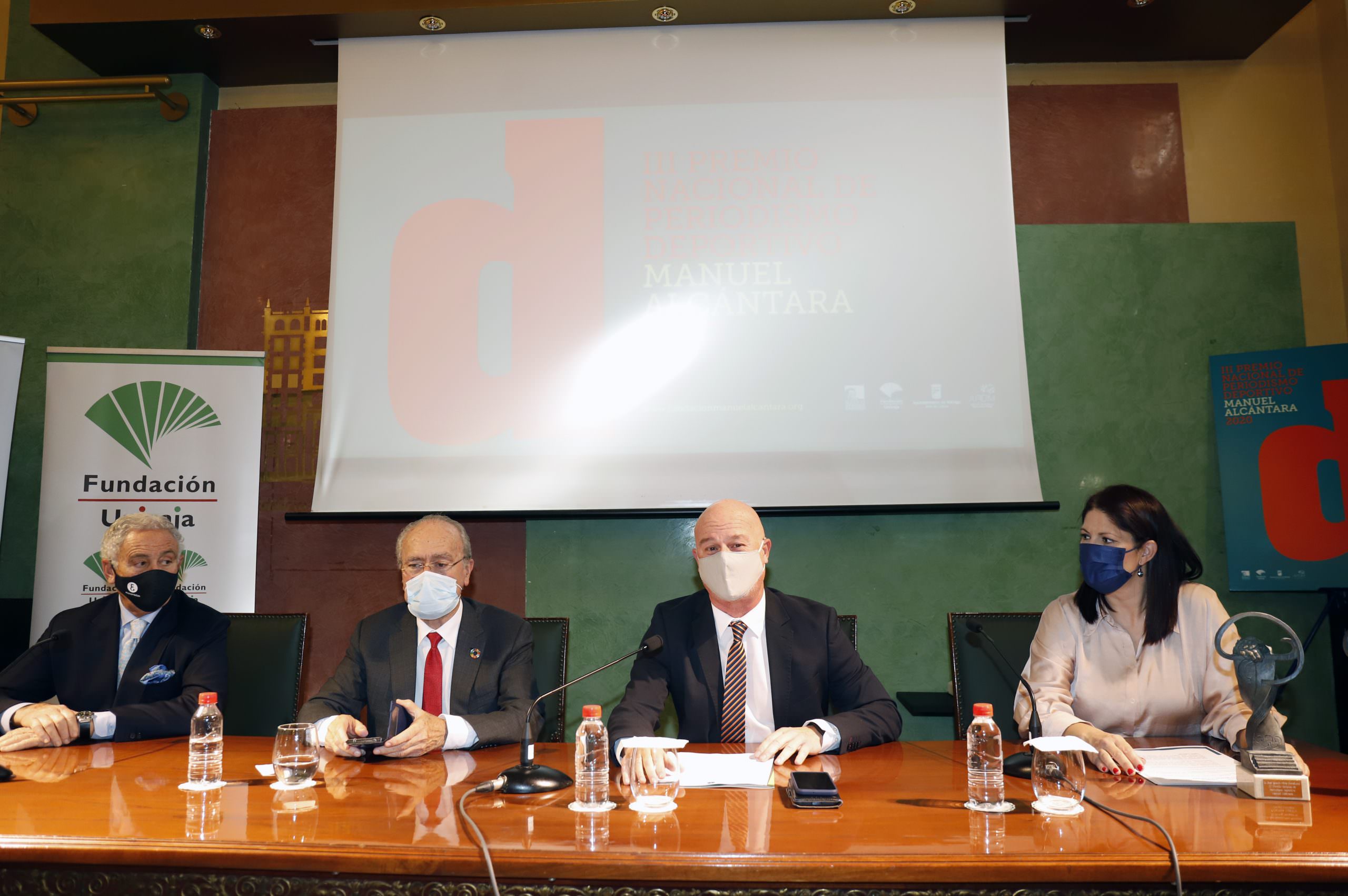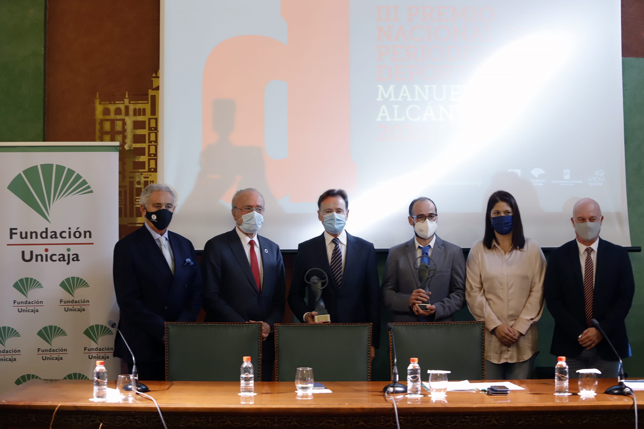 Fundación Unicaja colabora con el III Premio Nacional de Periodismo Deportivo Manuel Alcántara, que ha premiado este miércoles, 15 de diciembre, a los periodistas Matías Prats y José Ignacio Pérez. El galardón, organizado por la Fundación Manuel Alcántara con la colaboración también del Ayuntamiento de Málaga y la Asociación de Periodistas Deportivos de Málaga (APDM Málaga), se ha celebrado en el salón de actos Unicaja y ha contado con la presencia del responsable de Publicaciones y Premios de la Fundación Unicaja, Francisco Cañadas; el alcalde de Málaga, Francisco de la Torre; el presidente de la Fundación Manuel Alcántara, Antonio Pedraza; y la concejala del Área de Cultura y Deporte del Ayuntamiento de Málaga, Noelia Losada.