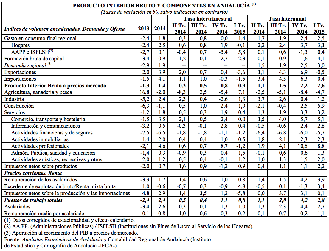 La información coyuntural más reciente, relativa al primer trimestre de 2015, refleja que la economía andaluza prolongó la trayectoria de crecimiento iniciada a finales de 2013, registrando un aumento intertrimestral de la producción del 0,9%. En términos interanuales, el crecimiento del PIB se ha situado en el 2,6% (0,4 p.p. superior al del trimestre anterior).