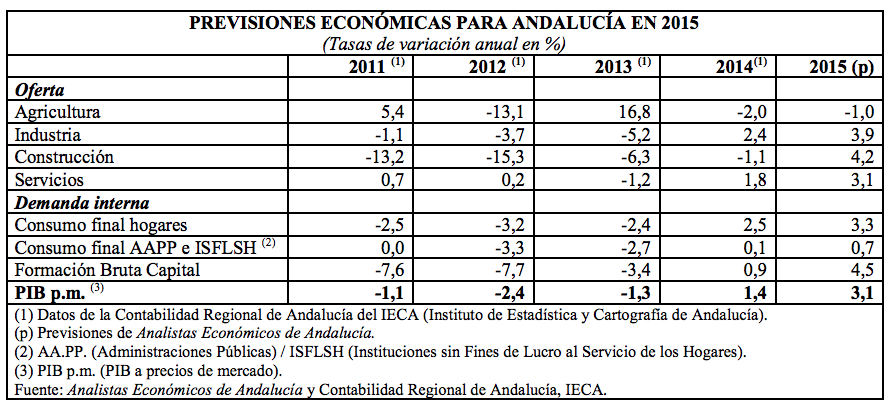 Para el conjunto de 2015, Analistas Económicos de Andalucía eleva la previsión de crecimiento de la economía andaluza en 0,5 p.p. hasta el 3,1% (3,0% para España), como consecuencia de una mayor aportación esperada de la demanda regional. Se prevé que la inversión registre un crecimiento anual del 4,5%, mientras que el gasto en consumo de los hogares presentaría una tasa positiva del 3,3%. Por su parte, el gasto de las administraciones públicas experimentaría un crecimiento del 0,7%.