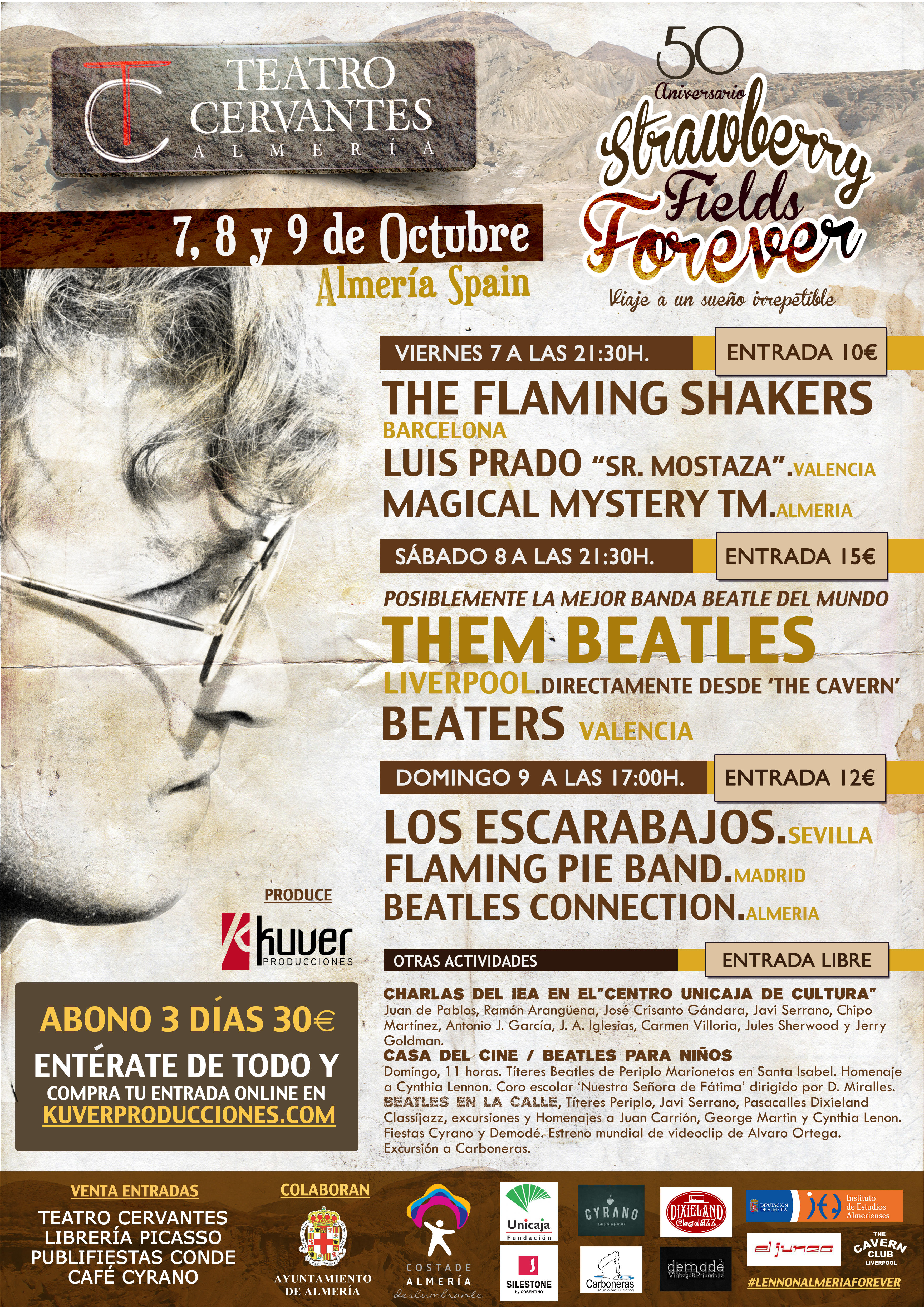 El festival, con el que se pretende poner de manifiesto la vinculación de la figura del beatle con el destino ‘Costa de Almería’ y el hermanamiento de esta ciudad con la inglesa de Liverpool, y en el que, además de Unicaja, colaboran otras instituciones y entidades como la Diputación almeriense y el Ayuntamiento de la capital, coincide con el 50 aniversario de la composición de ‘Strawberry Fields Forever’, pero también con el cumpleaños de John Lennon el 9 de octubre.