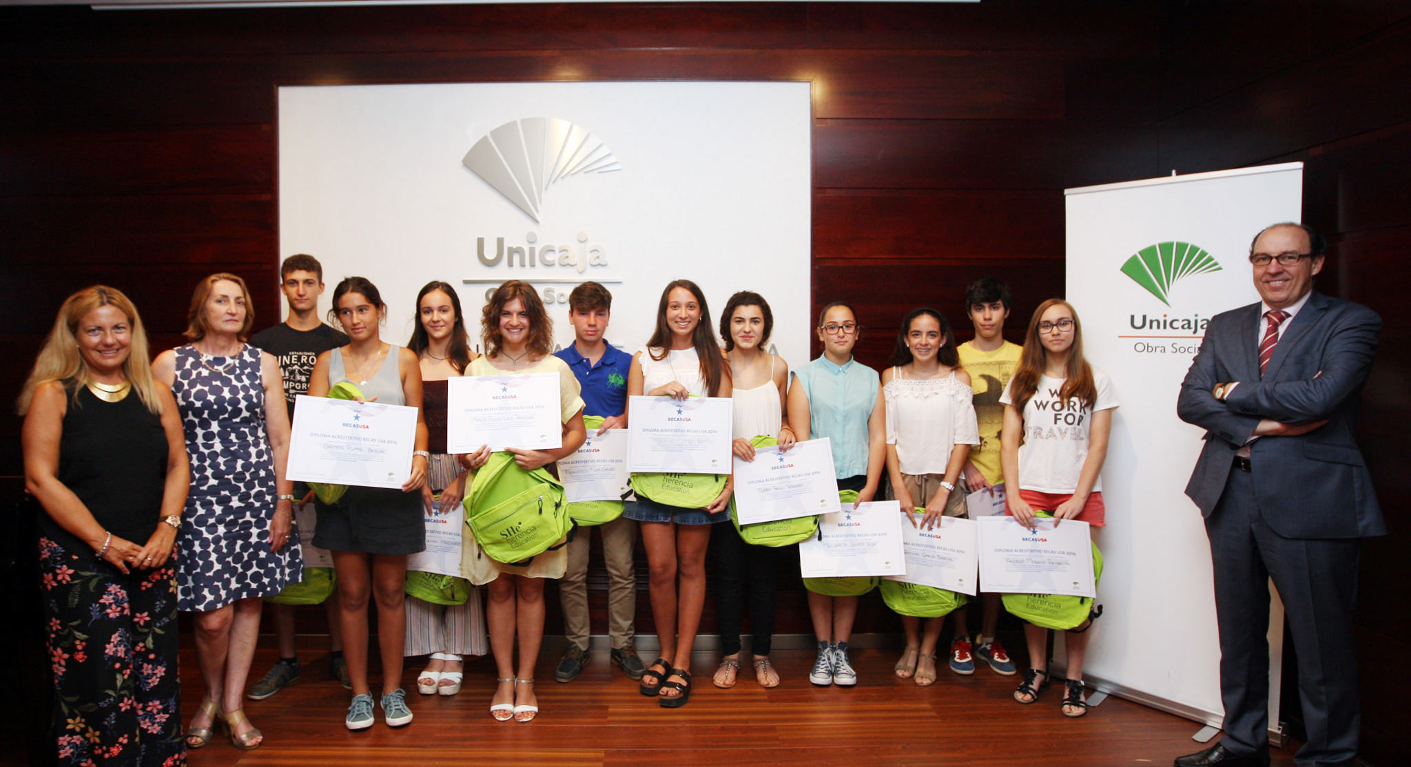 La Fundación Bancaria Unicaja, a través de su Obra Social, ha entregado un año más sus becas a un total de 68 jóvenes para participar en el programa de convivencia ‘Experiencia familiar y escolar en Estados Unidos 2016’, llevado a cabo por la Organización para Idiomas en el Extranjero SHE Herencia y por el que viajarán un total de 117 estudiantes.