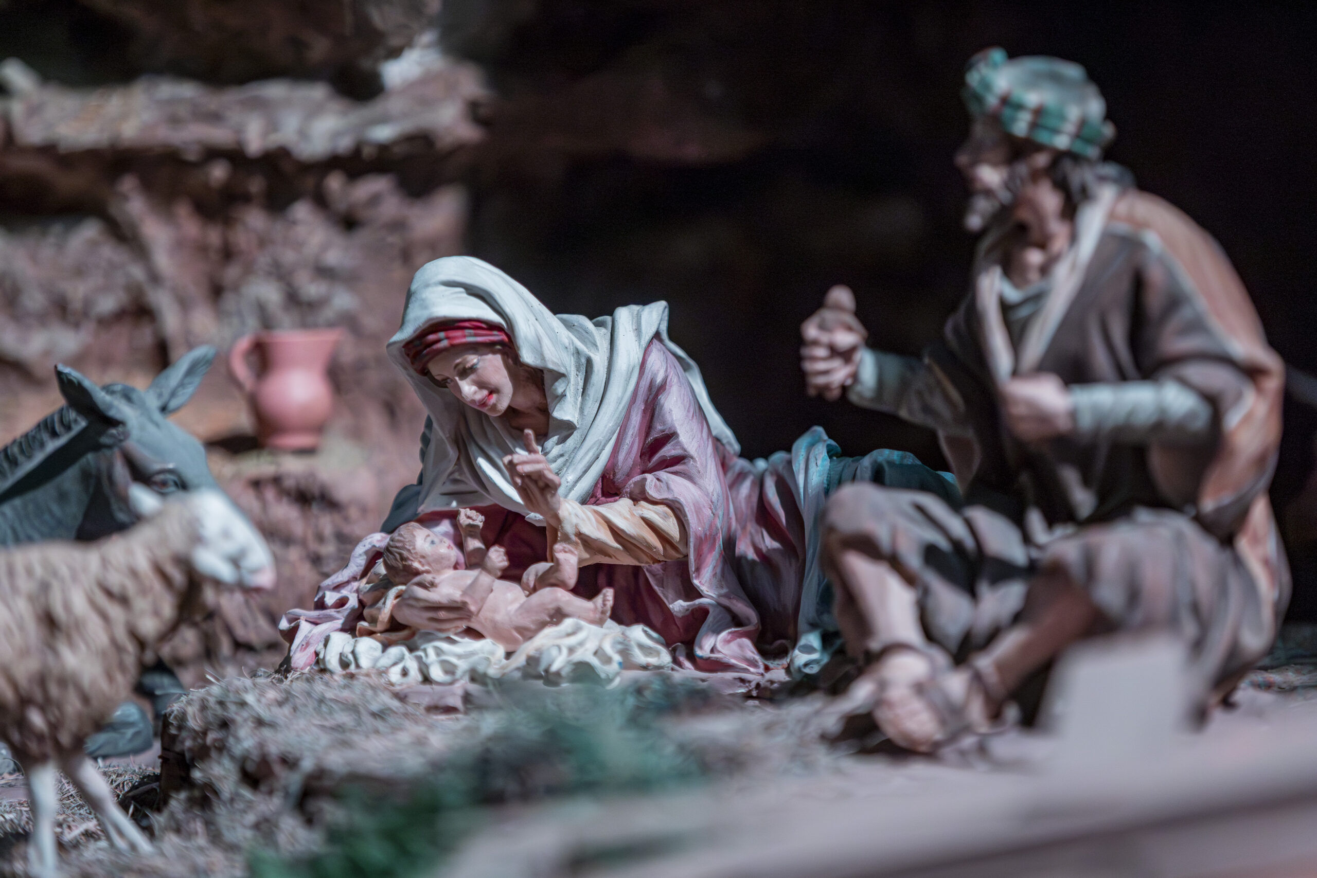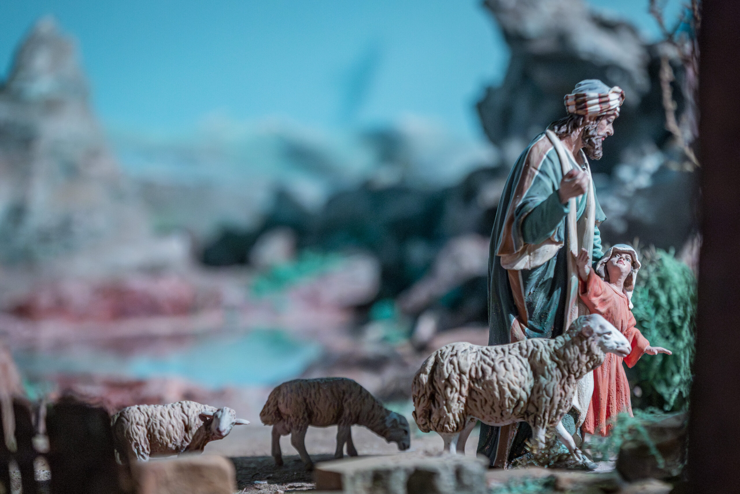Aunque la escena es continua, podemos dividirla en varias partes que, de forma piramidal, se superponen de forma ascendente; desde la Natividad, situada en primer plano a través de figuras que alcanzan los 35 cm. de altura, hasta el paisaje montañoso que corona la escenografía, pasando, en los planos medios, por diversas escenas protagonizadas por los pastores, los Reyes Magos de Oriente, un gran lago y dehesa rodeados de animales o un el maravilloso pueblo habitado por artesanos y animales.
