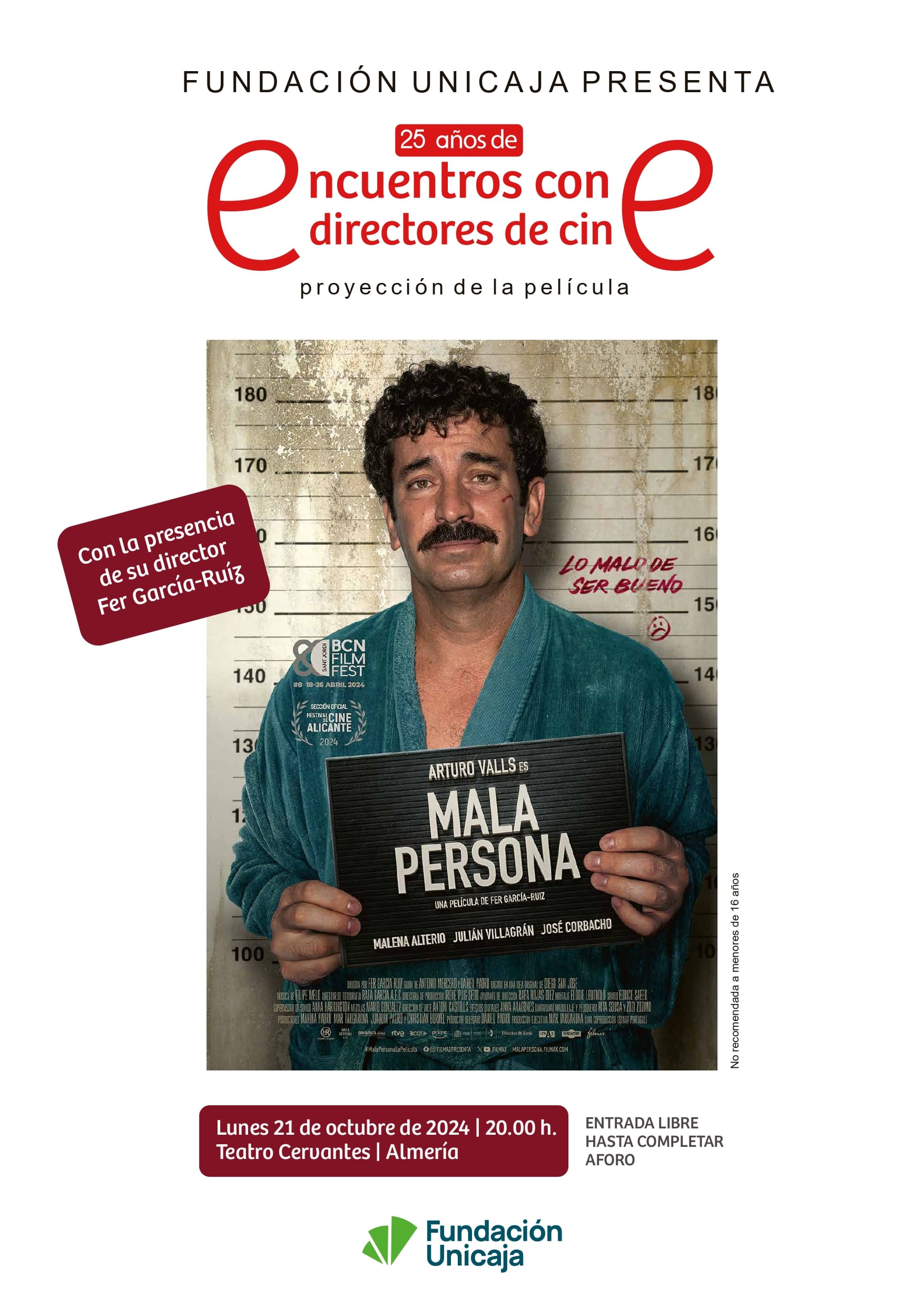 Fundación Unicaja organiza una nueva cita de su ciclo ‘Encuentros con directores de eine’ el lunes 21 de octubre con la proyección y posterior coloquio de la película ‘Mala persona’ de Fer García-Ruíz, que tendrá lugar a las 20:00 horas en el Teatro Cervantes de Almería con entrada libre hasta completar aforo.
