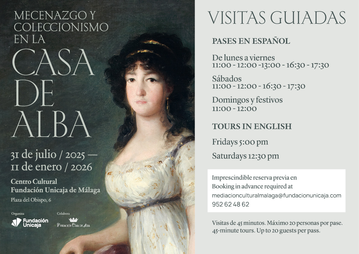 Se ofrecen visitas guiadas gratuitas para grupos de máximo 20 personas, de lunes a viernes a las 11:00, 12:00, 13:00, 16:30 y 17:30 horas; los sábados a las 11:00, 12:00, 16:30 y 17:30 horas, y los domingos a las 11:00 y 12:00 horas. Además, se ofrecerán dos pases en inglés los viernes a las 17:00 horas y los sábados a las 12:30 horas. Las visitas se pueden reservar en mediacionculturalmalaga@fundacionunicaja.com o en el teléfono 952 62 48 62.